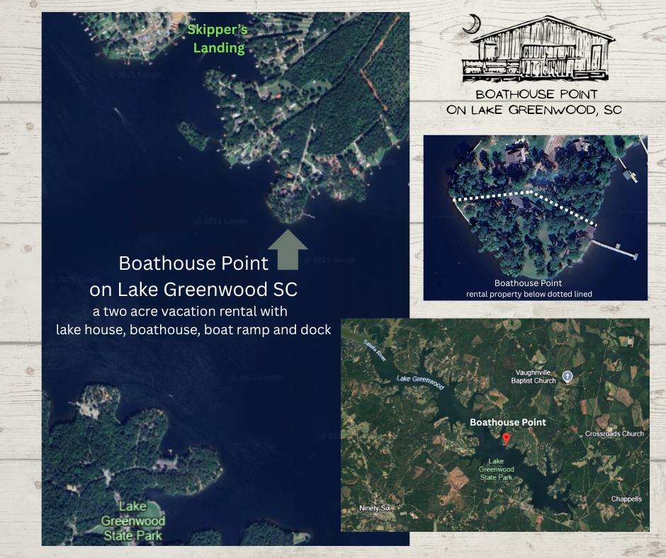 Located just over an hour from the Columbia SC airport, Greenville SC airport, and the Masters at Augusta National, Boathouse Point on Lake Greenwood is a certified National Wildlife Federation habitat overflowing with the sights and sounds of birds calling, fish jumping, and crickets chirping. Step back into the simple joys of family gatherings where parents and grandparents treat their children to the same kind of vacations they had - no screens required. Come and see why generations of family and friends agree this serene setting and peaceful respite is a truly special place. We think you'll love it here.